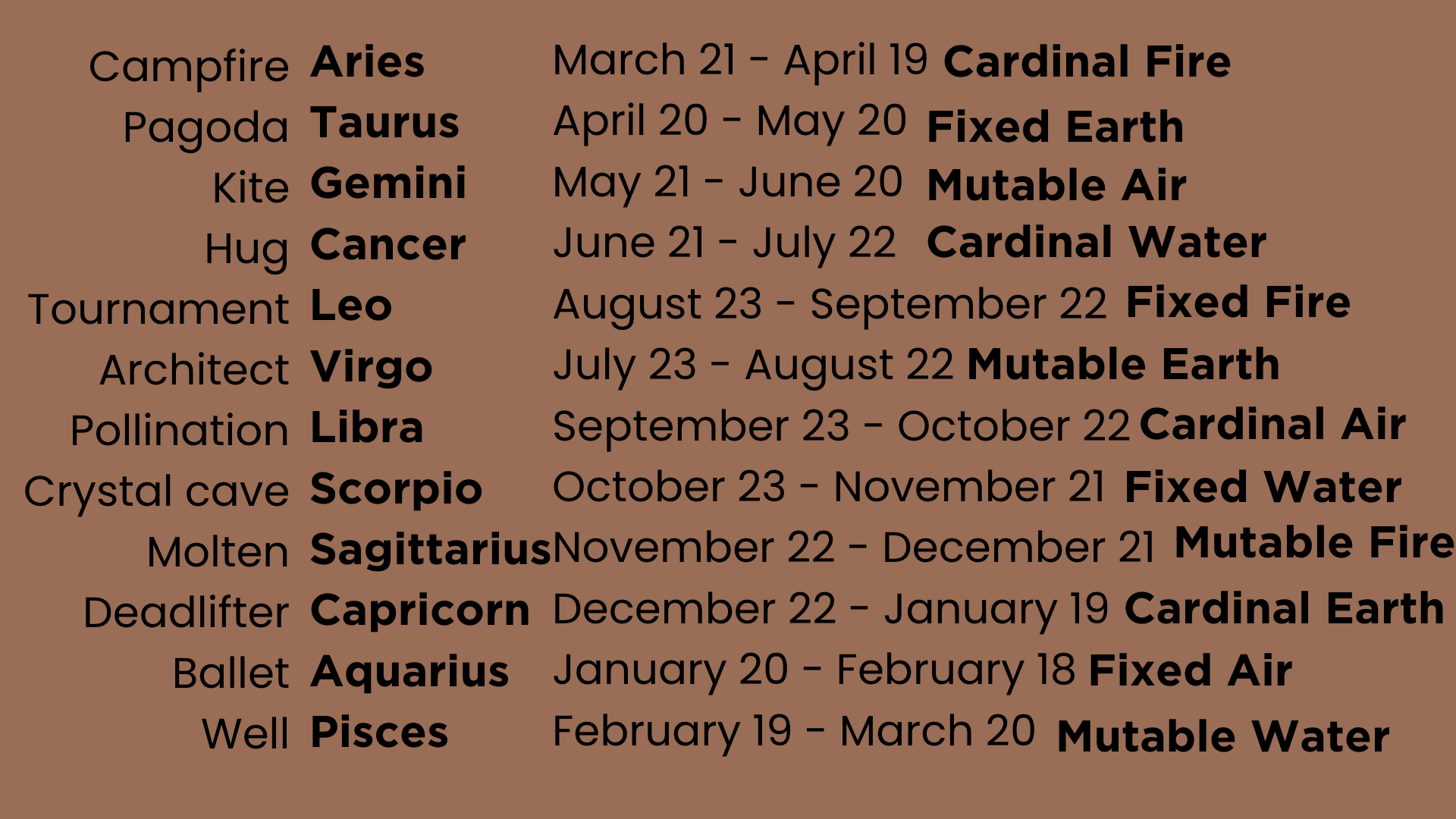 The Zodiacal belt was first identified as a pattern in the sky by Babylonian astronomy during the first half of the 1st millennium BC. They sectioned the sky into 12 quadrants, each assigned a name, figure, traits and meaning. Each zodiac is identified by its constellation, which corresponds to its figure, and is ruled by a specific planet. Each zodiac is either mutable (change is often), cardinal (resistant but when I decide it's big), or fixed (resistant to change) and associated with an element - fire, air, water, earth.