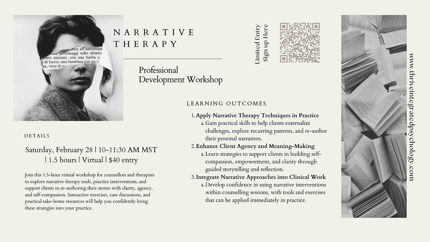 On Saturday, February 28, from 10–11:30 AM MST, I’m hosting a live virtual workshop, Integrating Narrative Therapy into Clinical Practice, designed for counsellors and therapists who want tools they can use immediately.